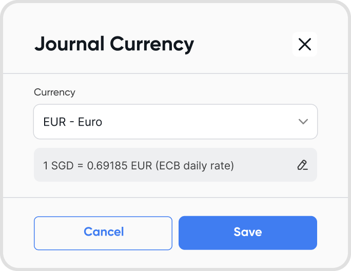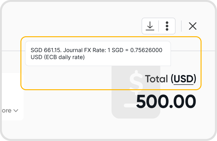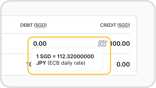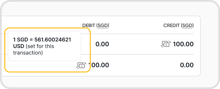 Hover on the currency ISO to show the exchange rate used for the journal, relative to the base currency.