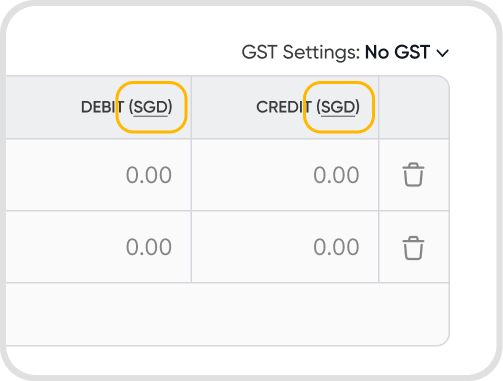 Click on the currency displayed in the Debit/Credit column headers to update the currency & set the exchange rate if required.