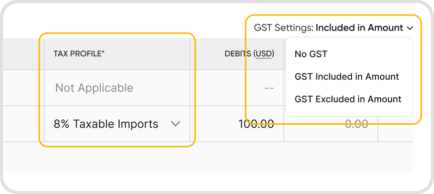 Included in Amount - Tax will be factored into your journal line entry amount, and you can choose a tax profile in the journal entry line for calculation.