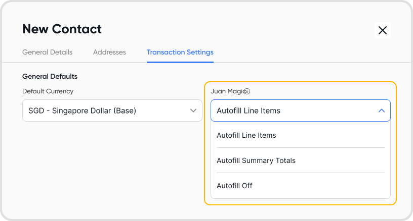 Transaction level settings for a contact which will be fetched and used to autofill a transaction based on the contact selected.