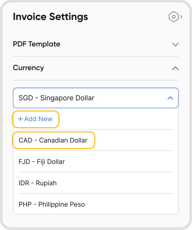 When choosing a currency under Invoice Settings,