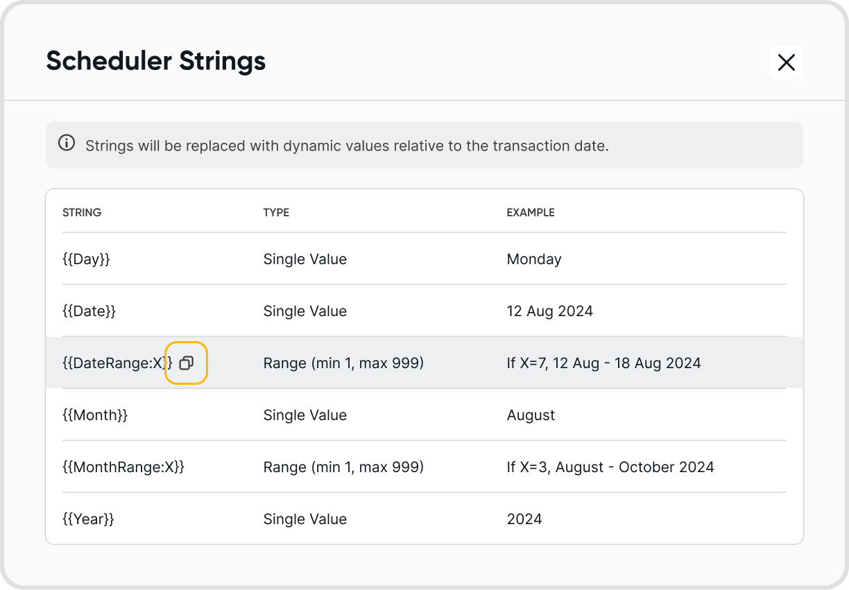 Hover over the string you want to use and click the copy icon to insert it into the invoice template