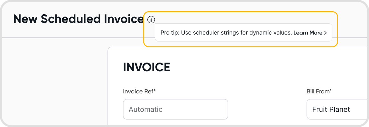 You can find the available scheduler strings in the information tooltip while creating a new scheduled invoice.