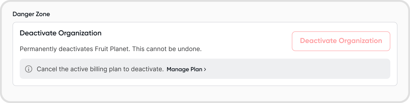 If the organization has a pending subscription, downgrade the organization first and then permanently deactivate it.