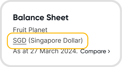 You can change the display currency of the balance sheet to other currencies that have been set up in your organization. For more information about setting up other currencies, refer to Accounting.