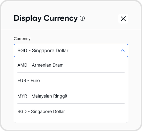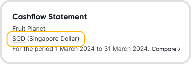 You can change the display currency of the cashflow statement to other currencies that have been set up in your organization. For more information about setting up other currencies, refer to Accounting.
