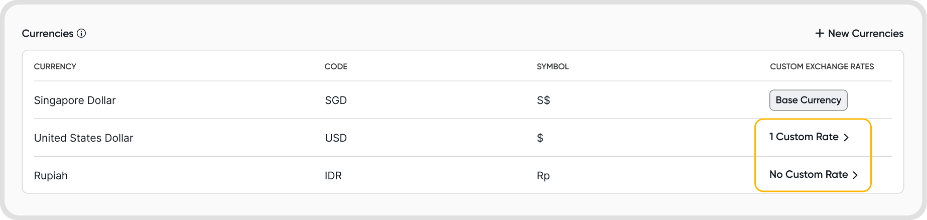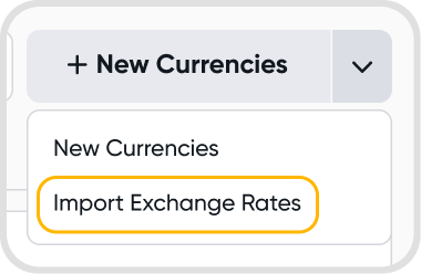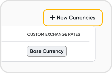 Adding custom rates for a currency means your organization can set up its own exchange rates instead of relying on third-party rates.