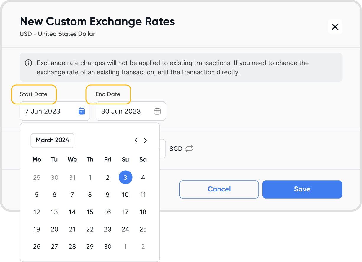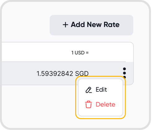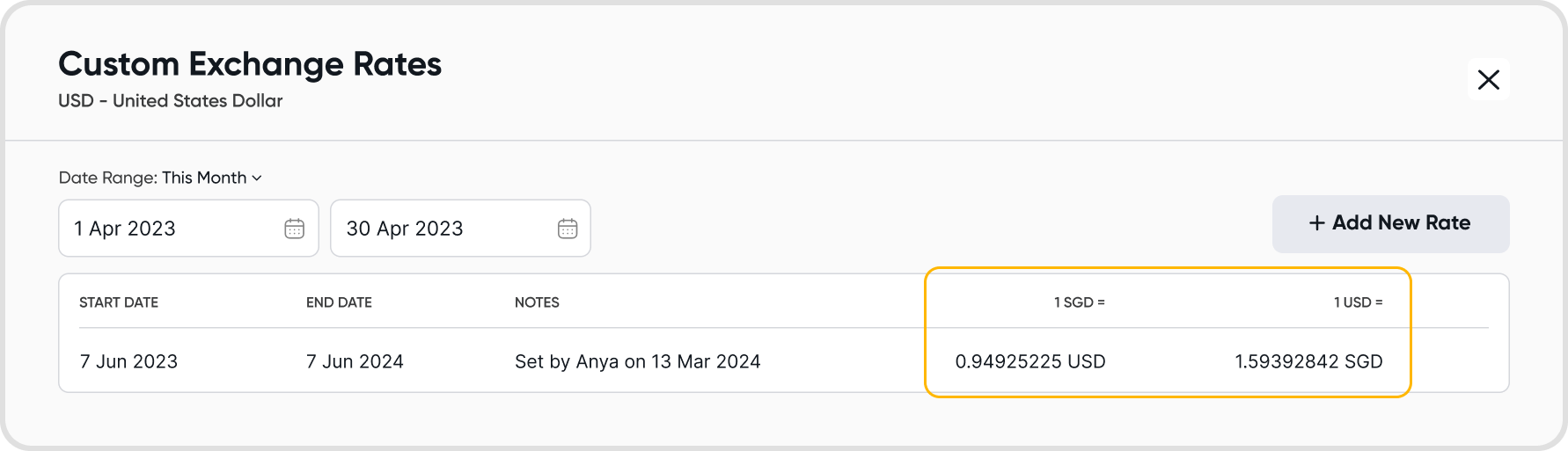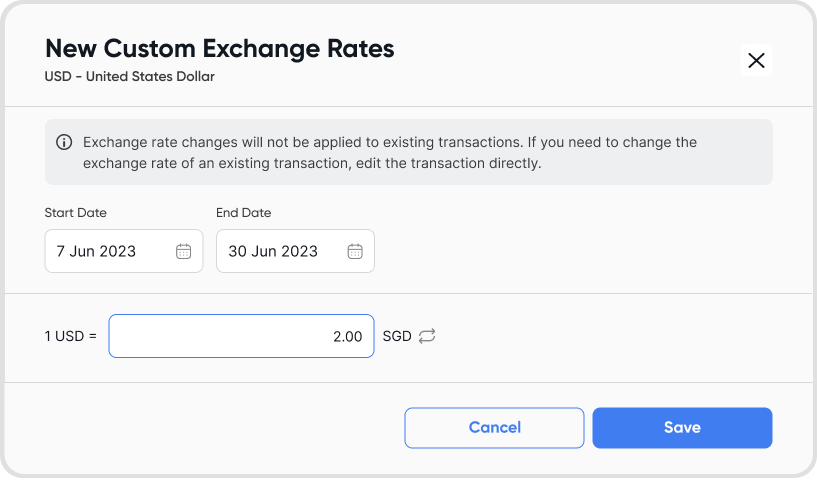 Enter the rate in your preferred denomination, e.g. 1 SGD: 1 USD or 1 USD: 1 SGD (Assuming that SGD is the base currency)