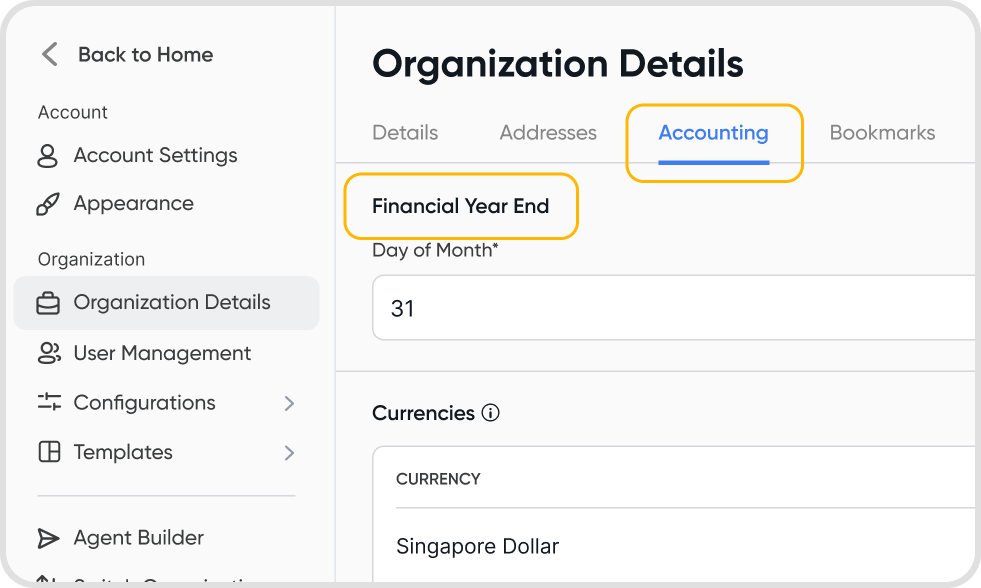 You can change the date/month of the financial year end under Settings > Organization Details > Accounting.