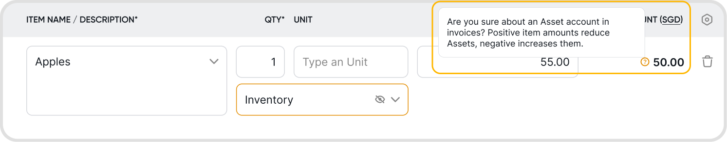 While there are no strict restrictions on the type of account you can select for an item in an invoice, Juan will warn you if you have selected an account that is not a Revenue Account.