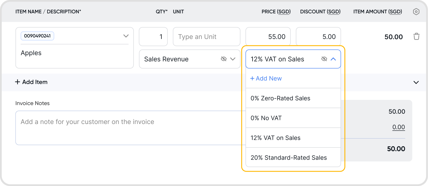 Afterwards, you will be able to select a GST/VAT profile for the line item.