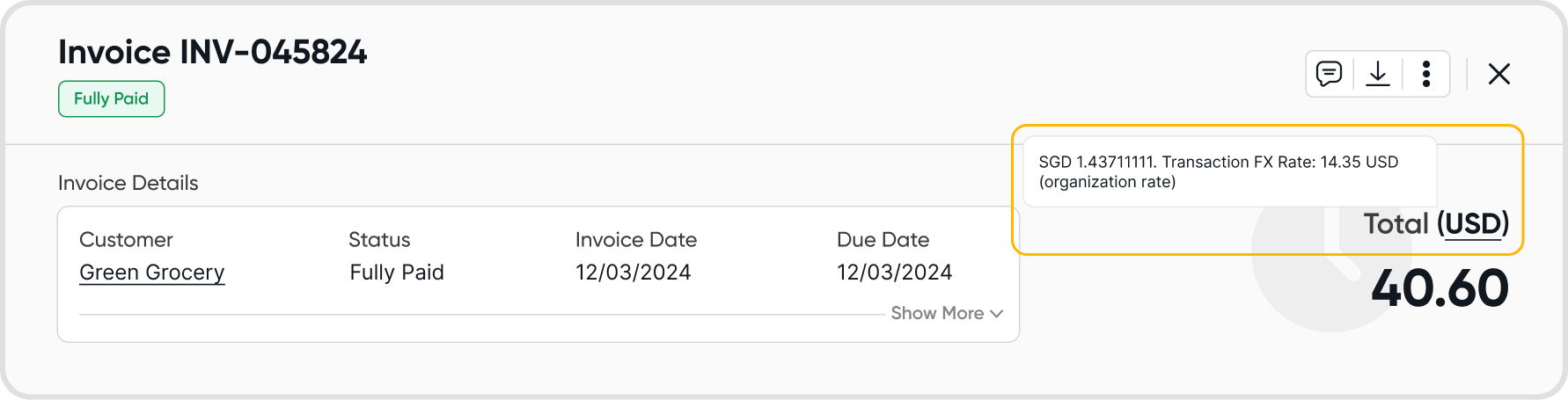 Hover on the currency ISO to show the exchange rate used for the invoice, relative to the base currency.