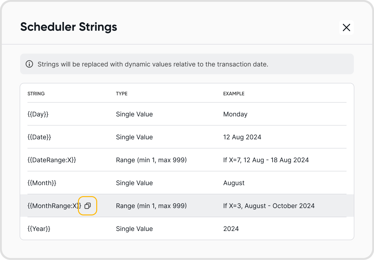 Hover over the string you want to use and click the copy icon to insert it into the invoice template