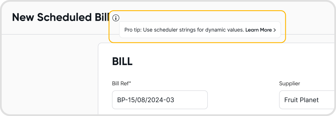 You can find the available scheduler strings in the information tooltip while creating a new scheduled bill.