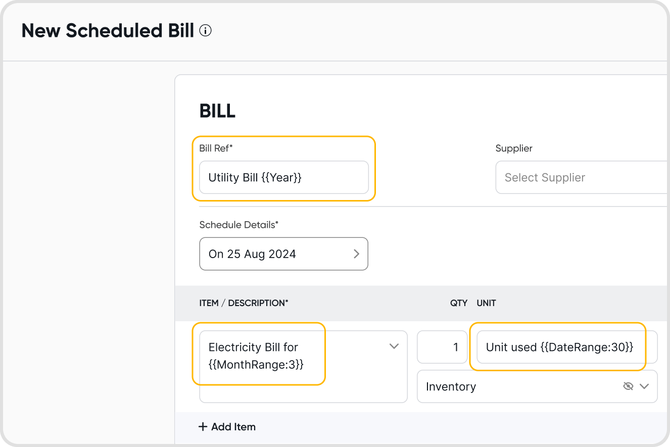 When the scheduler runs and generates a bill, the strings will be replaced with dynamic values based on the scheduler string type and the generated bill's transaction date.