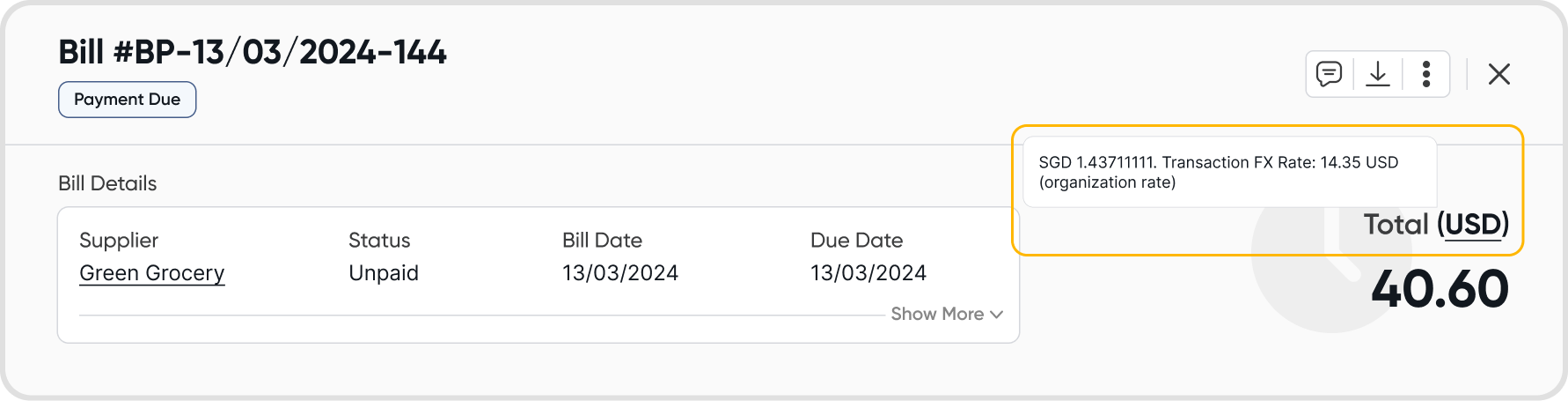 Hover on the currency ISO to show the exchange rate used for the bill, relative to the base currency.