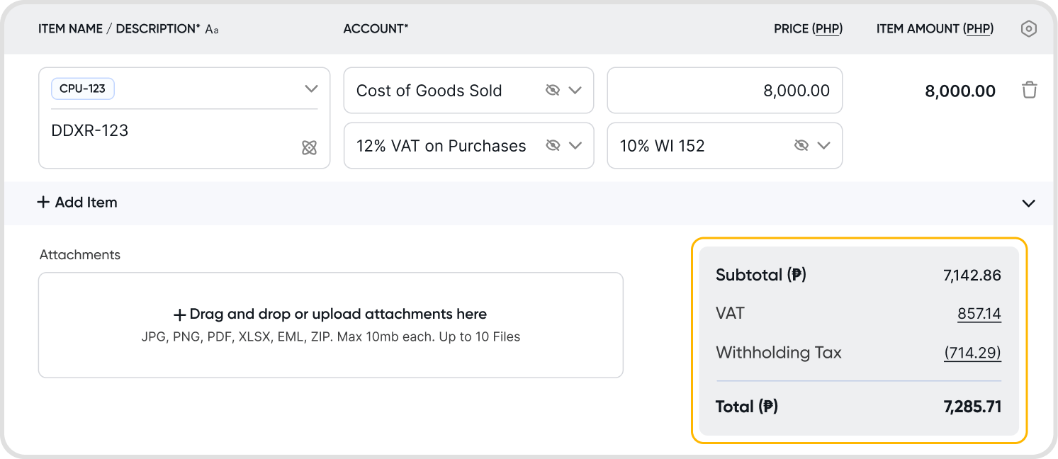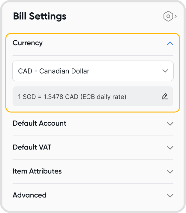 Upon choosing edit, you will see an Edit Bill page, where you can make changes to your bill headers, line items, attachments, or bill settings.