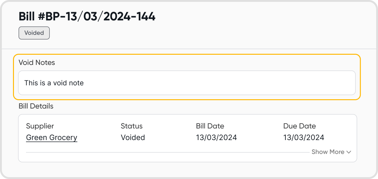 Other than confirming you want to void the bill, you can also add in internal notes at this stage for your team to view.