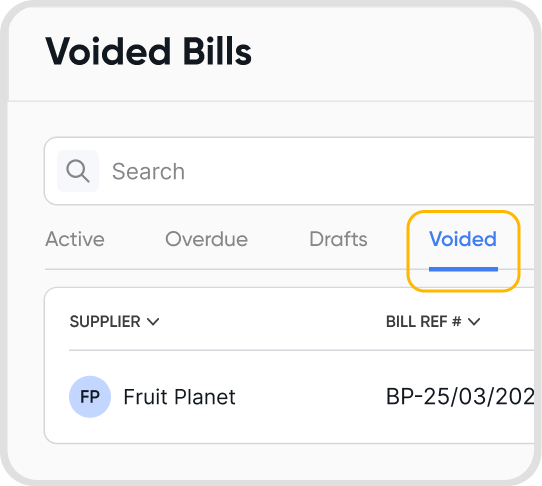 Find the void option in the bill details. Once done, you can find the voided records under the voided tab.