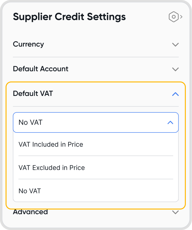 Supplier credit default setting: Settings that will automatically be applied by default at the start of the supplier credit note creation process for all supplier credit notes