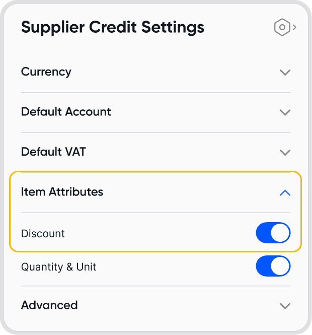 To add a discount, ensure that Discounts are enabled under Item Attributes in the Supplier Credit Settings.