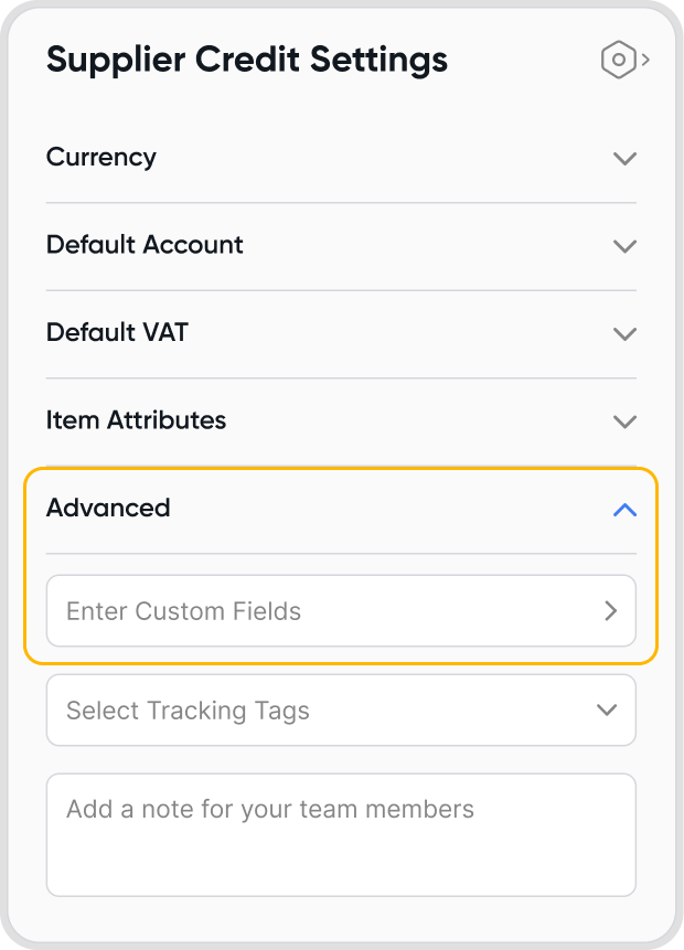 While creating a new supplier credit note, under Supplier Credit Settings > Advanced, enter Custom fields.