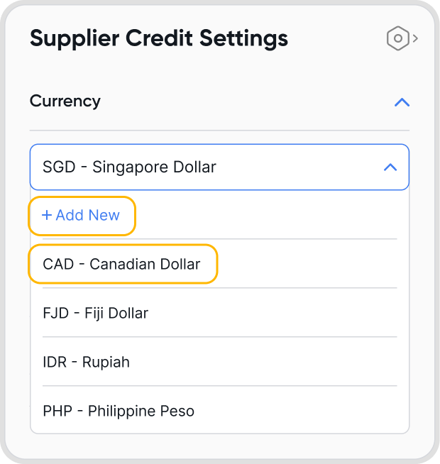 Click on the currency label within the supplier credit note. You will be brought to the currency settings.