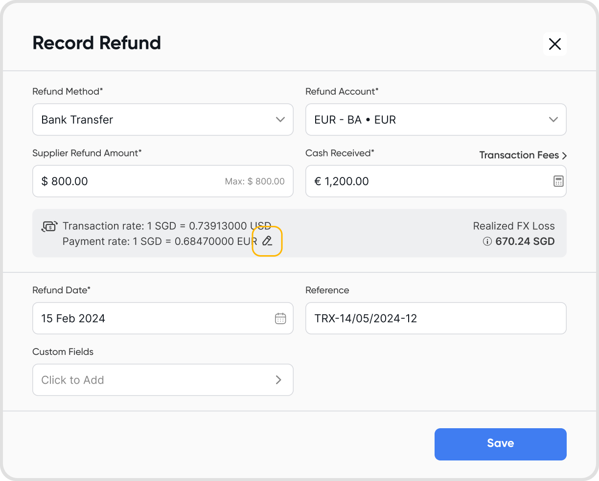Realized FX (Gain)/Loss = (Supplier refund amount / Transaction rate) - (Cash received amount / Payment rate)