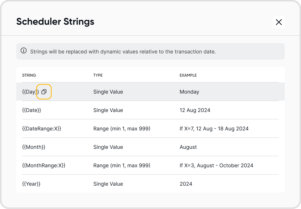 Hover over the string you want to use and click the copy icon to insert it into the journal template