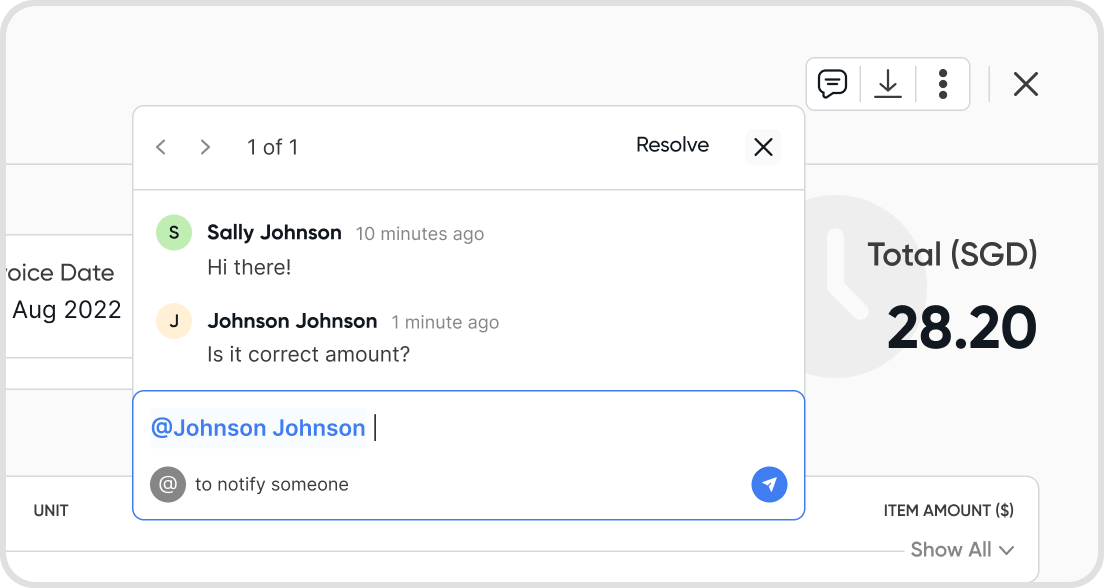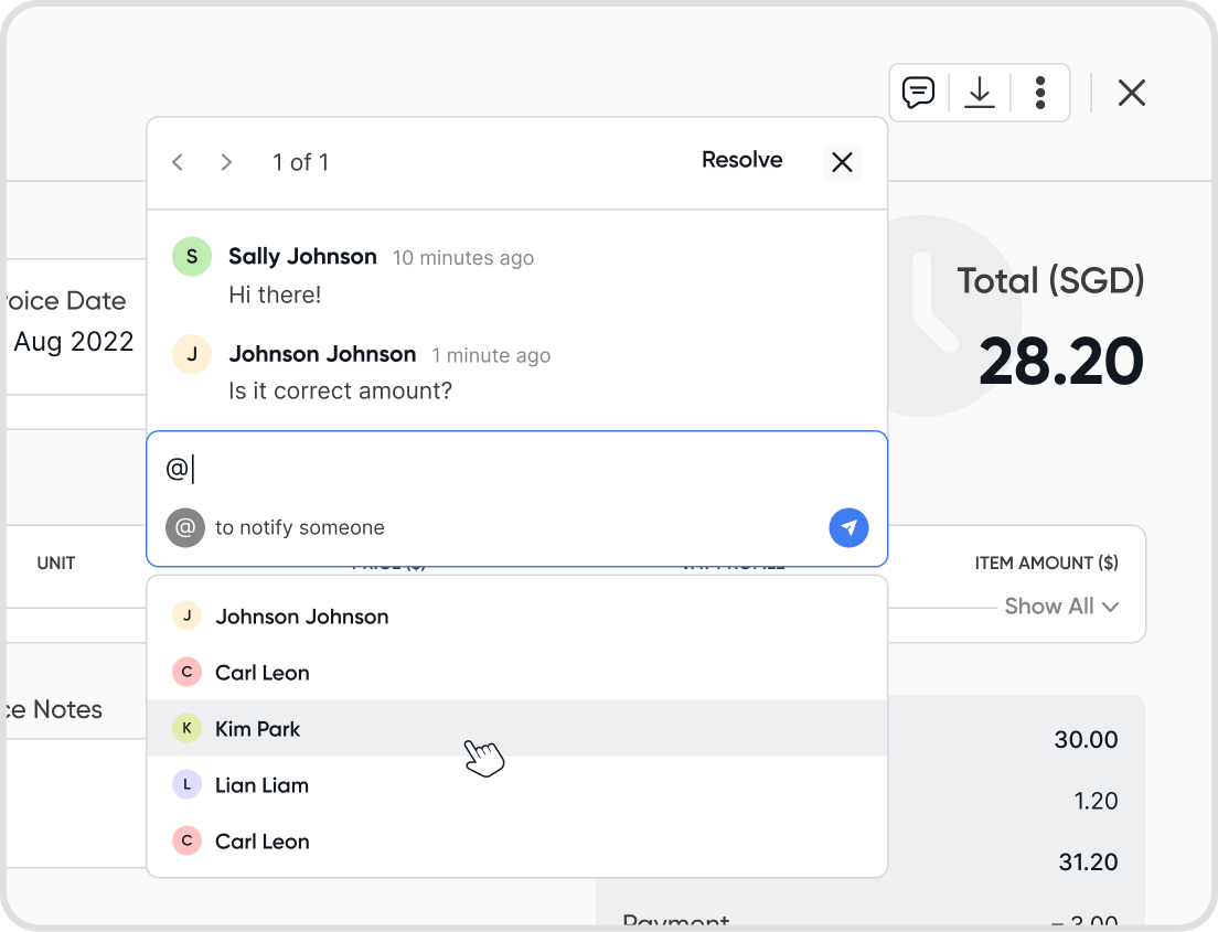 To mention someone, type @ while writing a comment. A list of users in your organization will show up.
