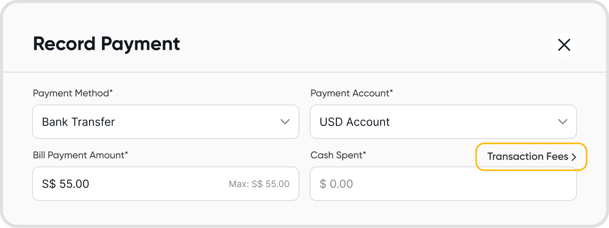 When you record a transaction fee for a bill payment, the transaction fee charged is added to the amount under Cash Spent.