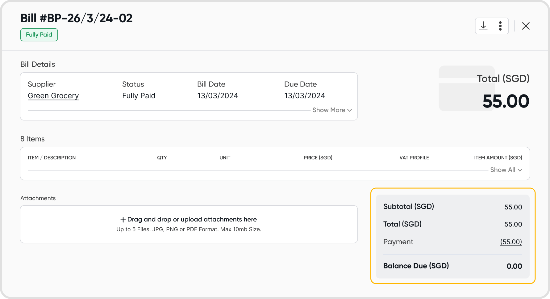 On the bill details, the payment amount shown in the bill total summary will reflect the Gross Cash Spent or the cash spent before fees.