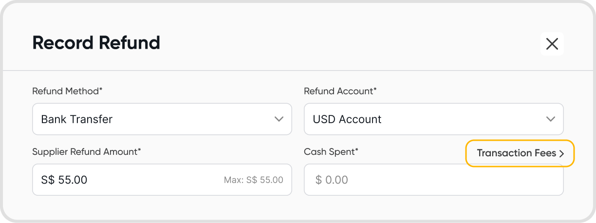 When you record a transaction fee for a supplier credit refund, the transaction fee charged is deducted from the amount under Cash Spent.