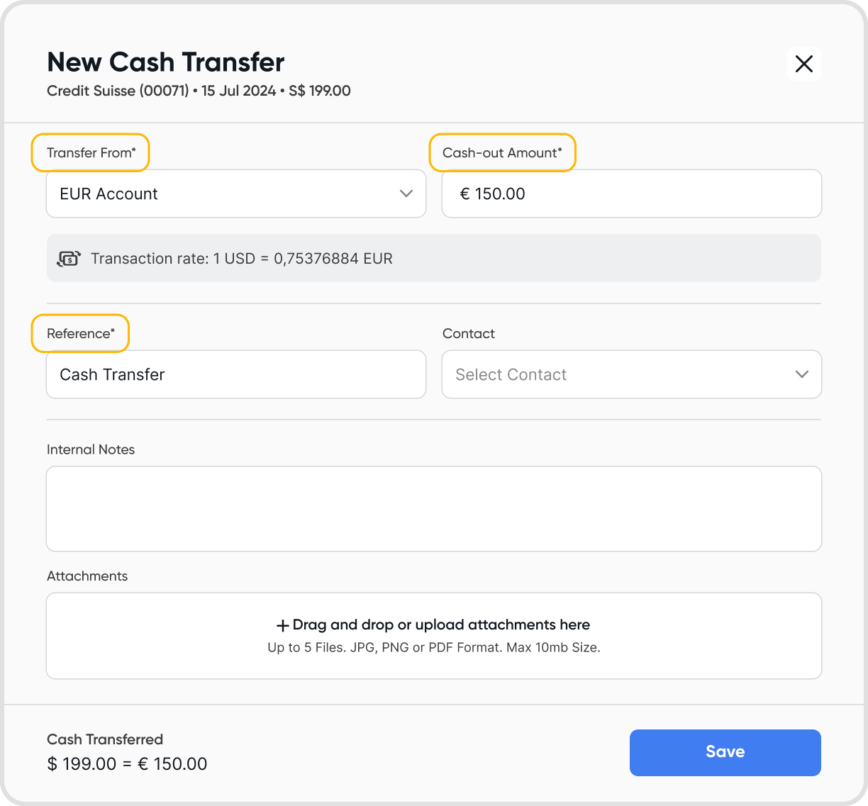 If the cash transfer is between 2 bank accounts of different currencies, Juan will calculate the transaction rate on the fly based on the amount entered by you and the statement line amount.