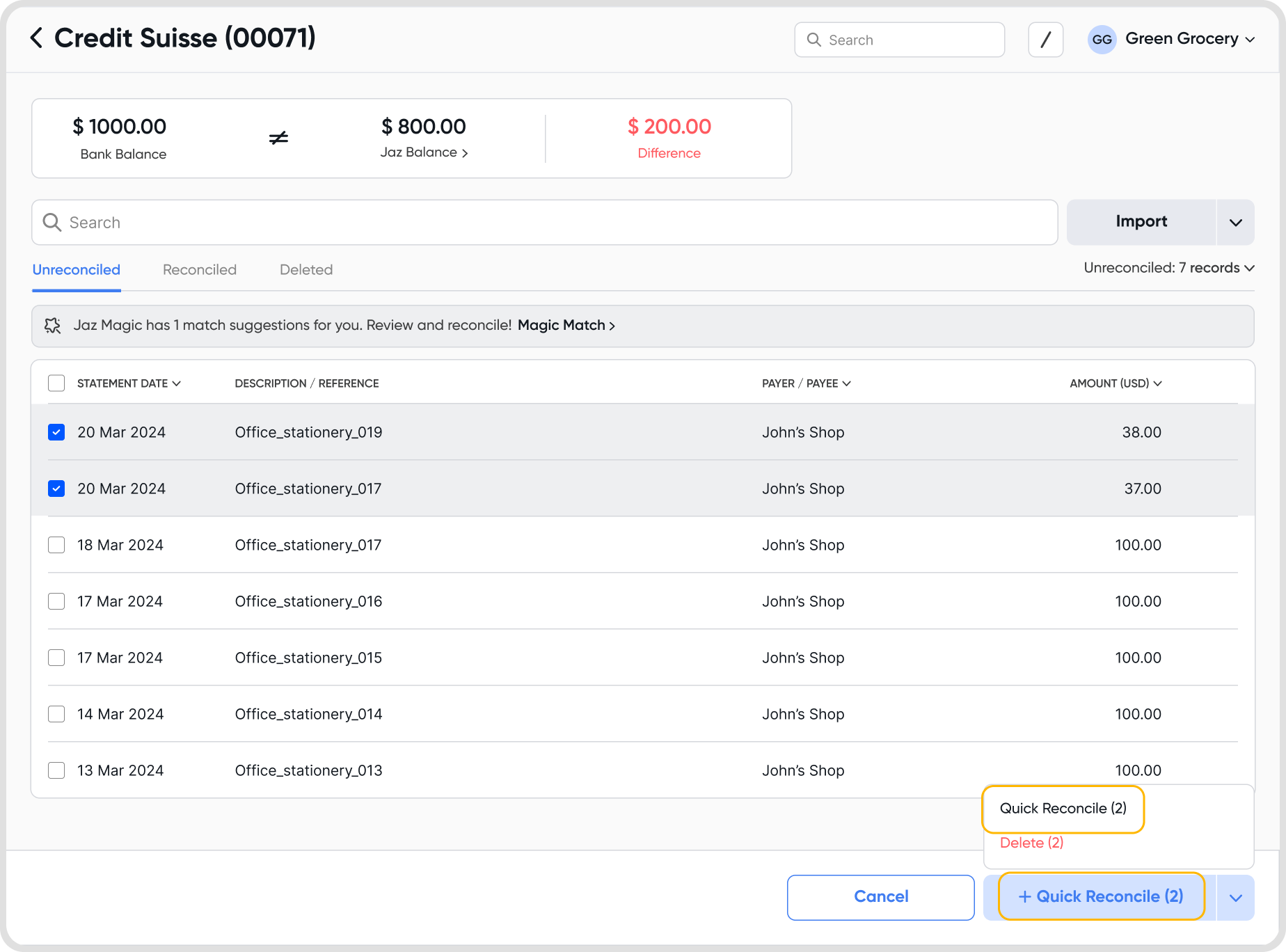 Yes. By default, Magic Sort is turned on. It helps you quickly match bank transactions to your records by automatically sorting entries based on amount and date proximity, making it easier to find the most relevant matches.