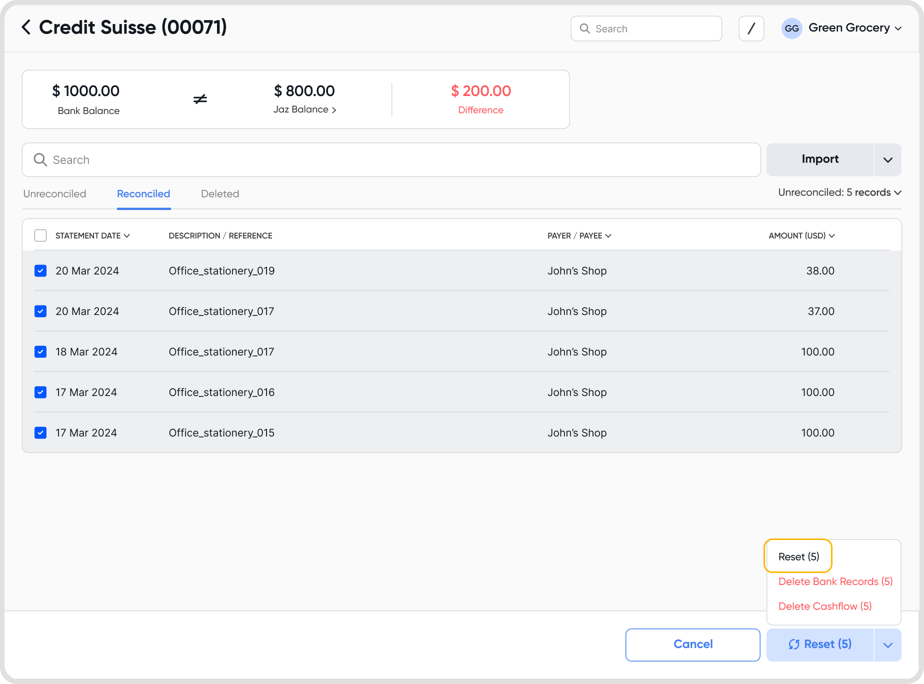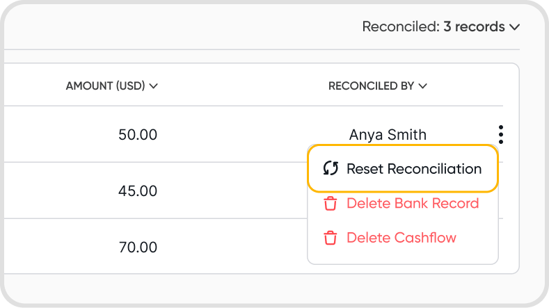 You can reset the reconciled statement lines individually using the 3-dot menu or you can bulk reset by multi-selecting desired records.