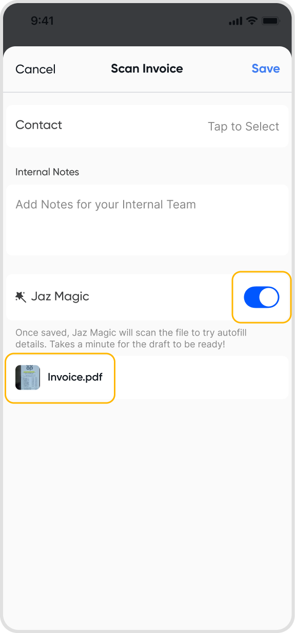 Enable the 'Juan Magic' toggle to merge all images into a single PDF file and upload it to create one invoice or bill draft, with details automatically filled from the scanned documents.