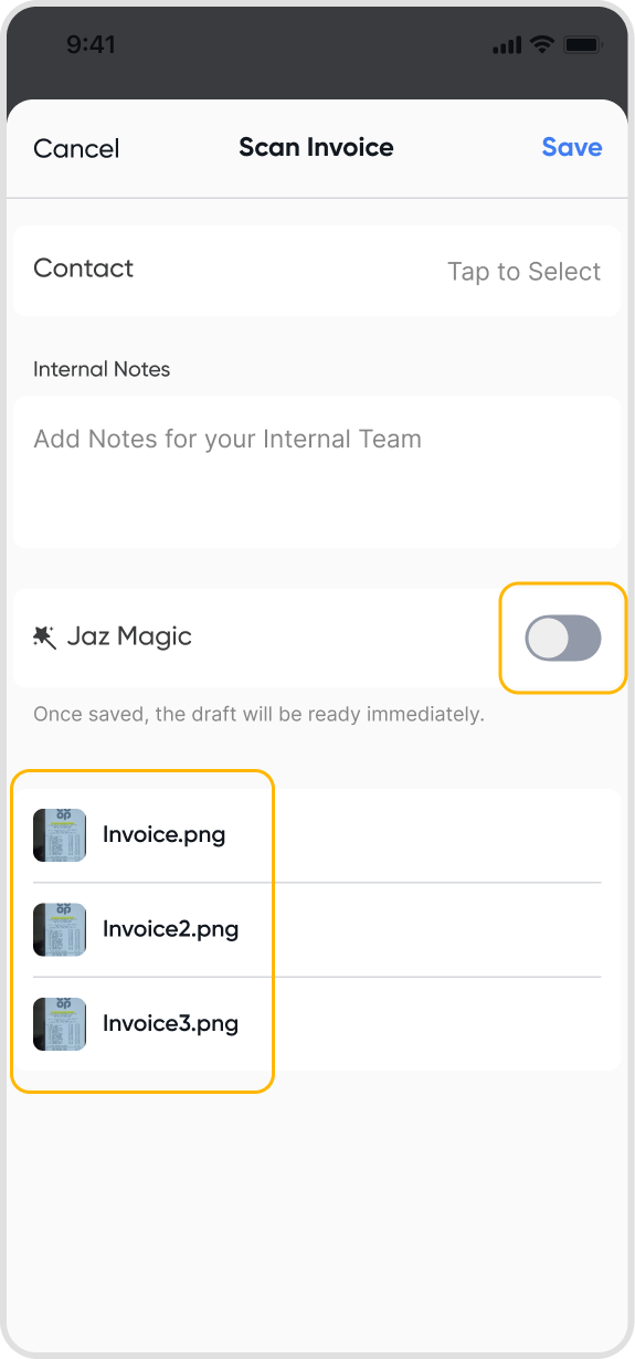 Simply toggle off the 'Juan Magic' feature after scanning the images, and each image will be uploaded as a separate attachment in the invoice or bill draft.