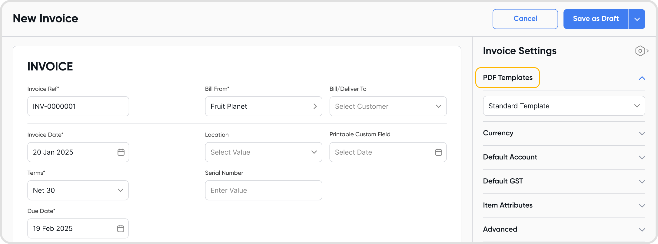 Note: Delivery Slip and Quotation PDFs will use the invoice template set for the transaction.