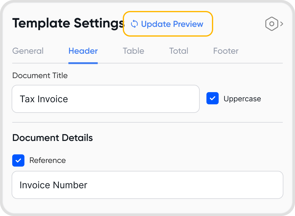 Enable/disable the total section, adjust spacing, configure balance labels, and add a tax summary for detailed breakdowns.