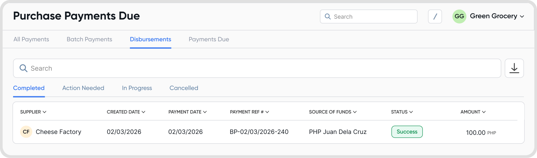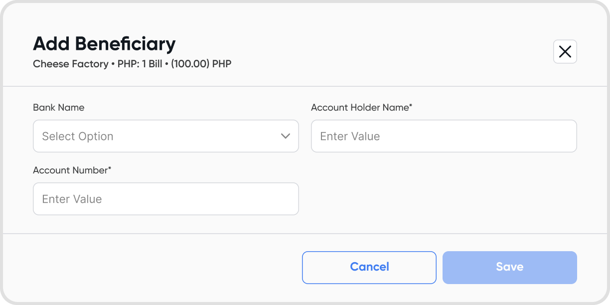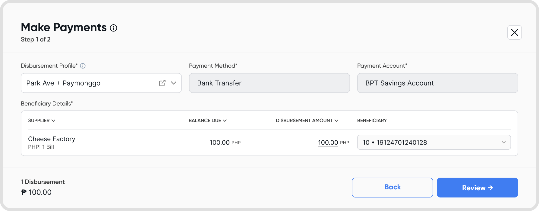 Add or select the beneficiary account for each vendor. This is the account where the payment will be sent.