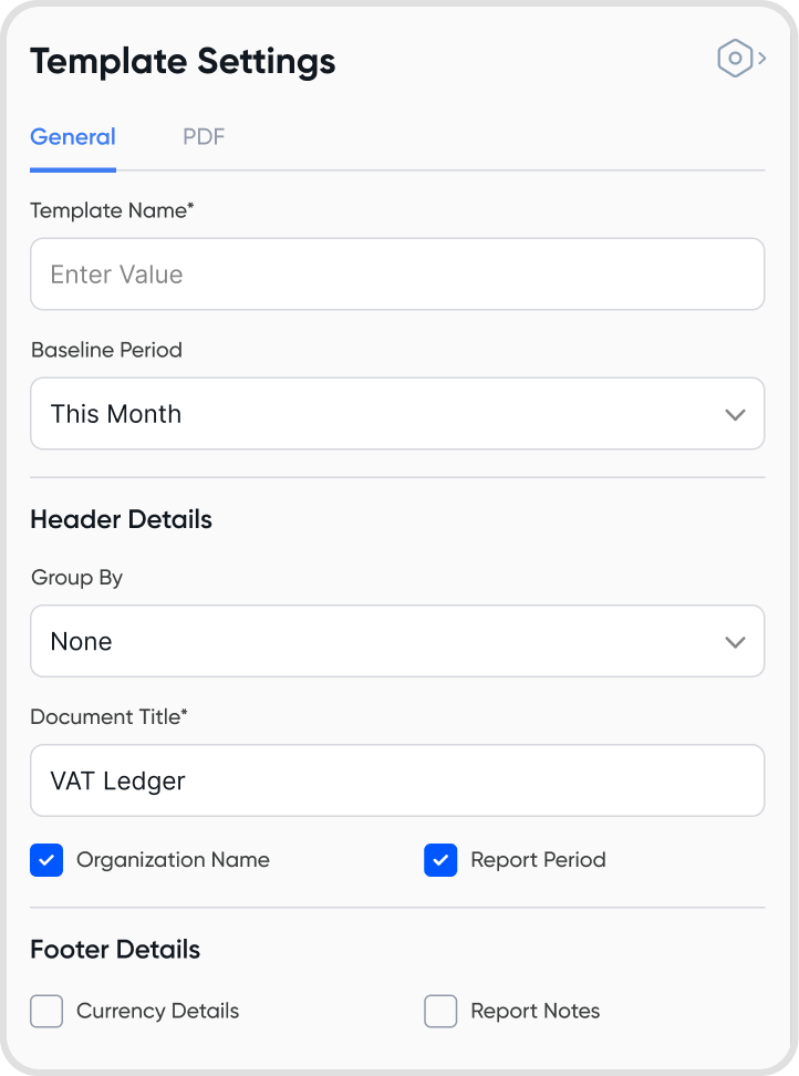 General: Edit template name, baseline period, header, and footer.