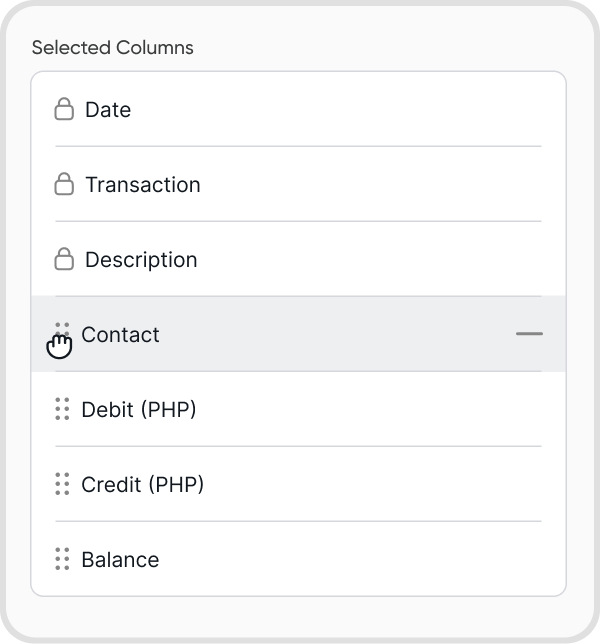 Note: Date, Transaction, and Description are locked. This means you cannot hide or re-arrange them. (PHP) pertains to the org’s default currency.