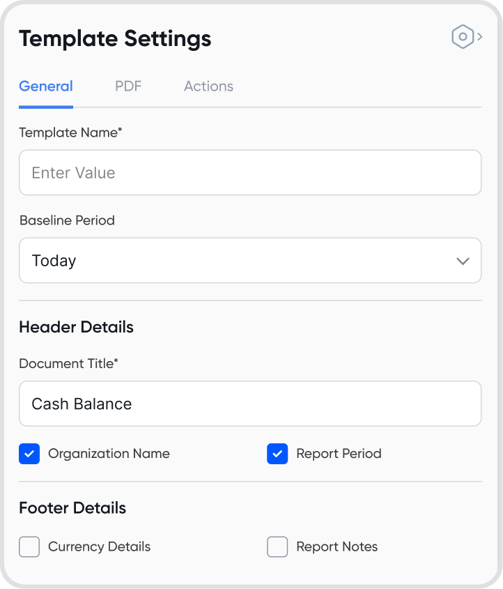 The Cash Balance template has three tabs: General, PDF, and Actions.