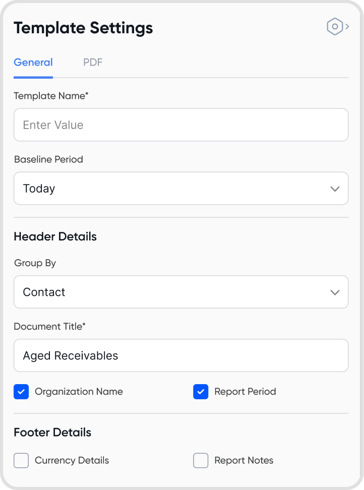 The Aged Receivables (Line Items) template has two tabs: General and PDF.