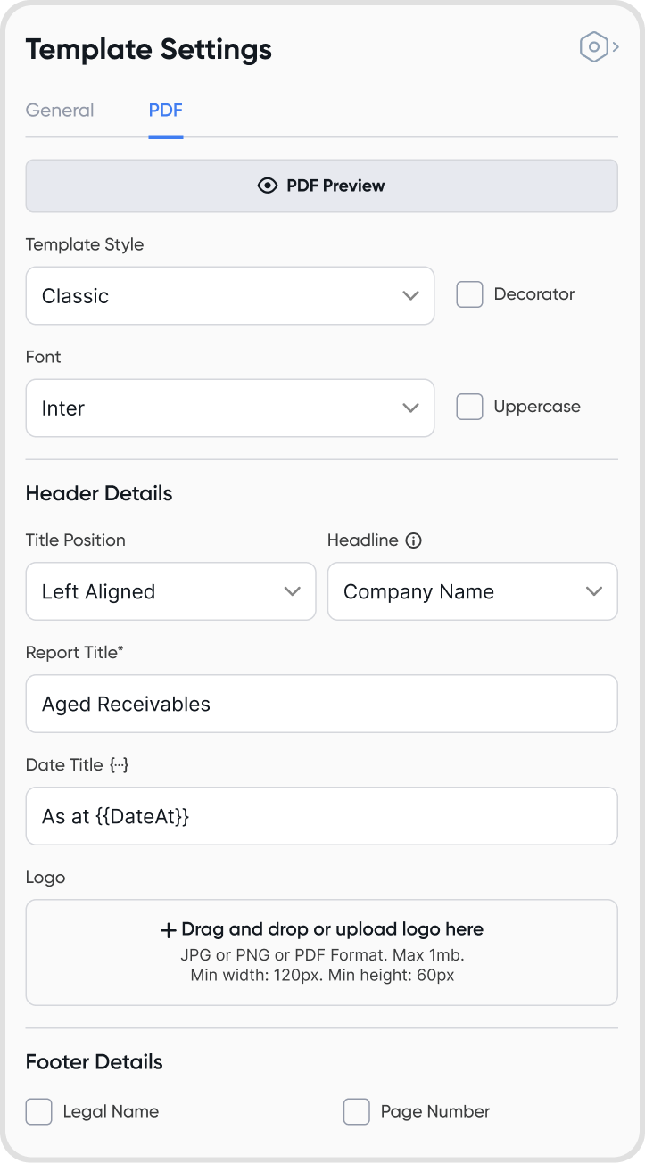 PDF: Customize layout, header, and footer for PDF version of the report.