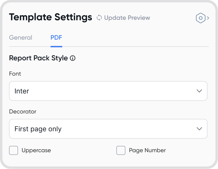 Report Pack–level settings override only universal elements like font, page numbers, and decorators.
