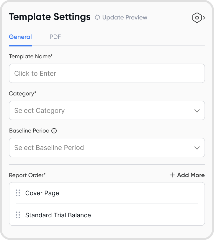Large templates such as the General Ledger take longer to generate due to the volume of data.