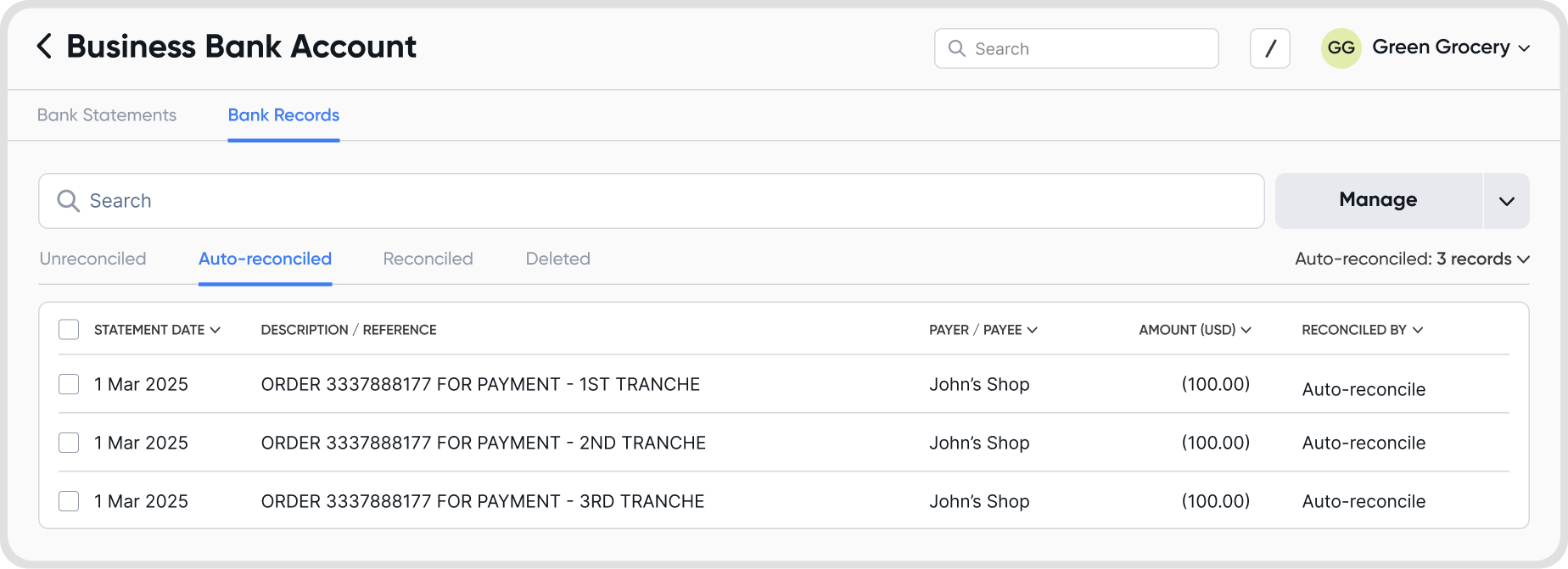 This tab lists all transactions that were automatically reconciled.