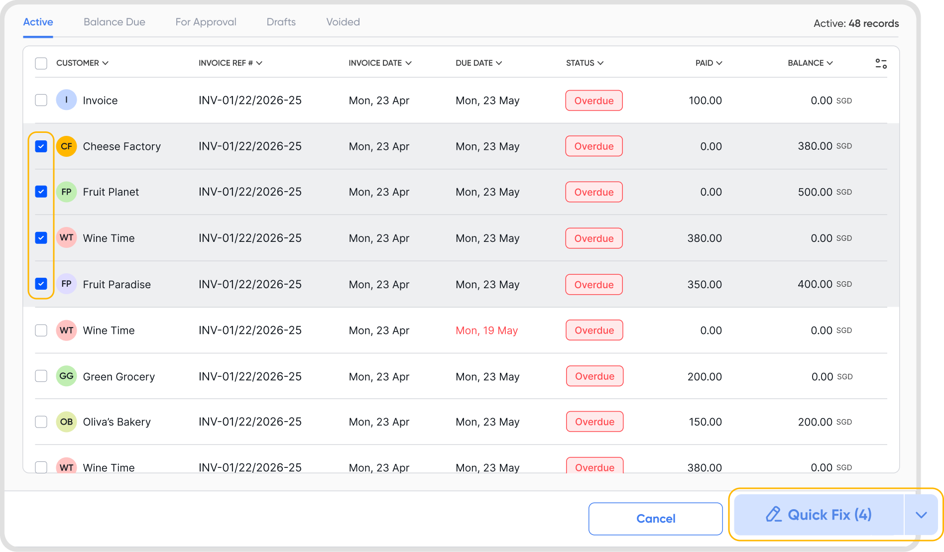Quick Fix lets you bulk edit selected fields across multiple transactions or line items at once.